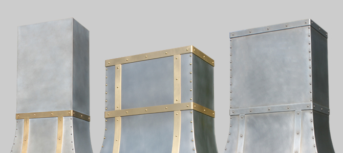 Haube Range Hoods are built out of premium, USA-sourced metals with artisan finishes applied according to your design. Choose from natural or antique Zinc, Copper, Brass, or Steel, which are then sealed to preserve the metal finish and delay oxidation. We also offer a variety of lustrous enamel finishes based on Sherwin Williams colors, or you may prefer to go with tried-and-true natural stainless steel, which does not receive a clearcoating.